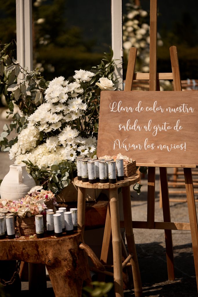 Añade un cartel bonito con una frase especial, como: “Llena de color nuestra salida al grito de ¡Vivan los novios!”.